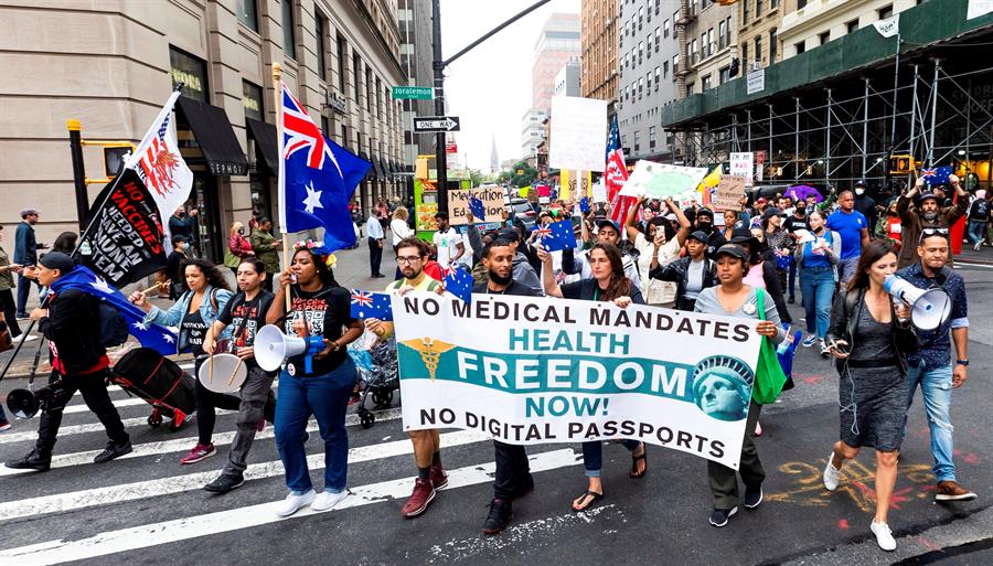 Entre cantos patrióticos y soflamas denunciando un supuesto trato discriminatorio, comparado por algunos participantes con el que la Alemania nazi practicó contra los judíos, la marcha de hoy tenía como destino final el consulado australiano en Nueva York, para denunciar las medidas impuestas por las autoridades del país oceánico contra quienes se niegan a vacunarse.