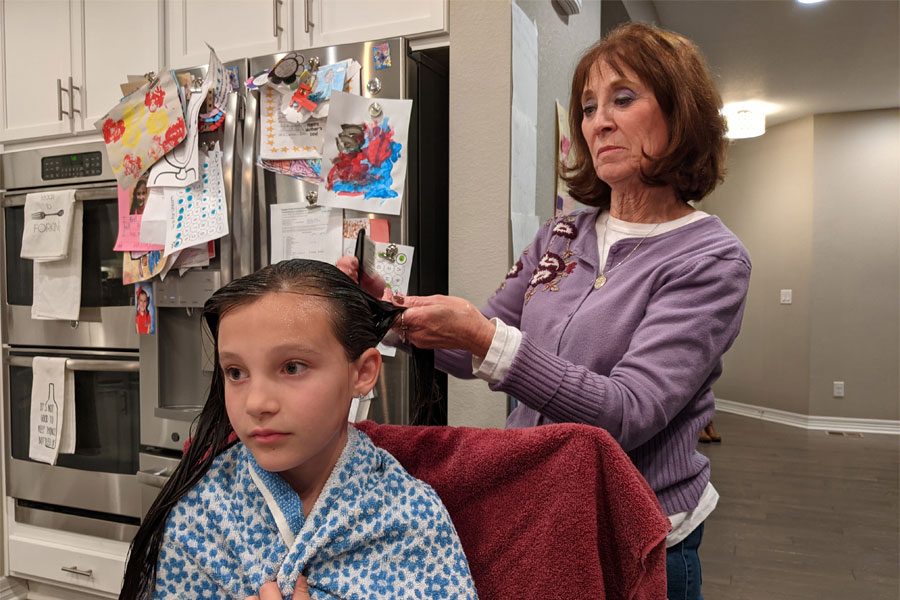 Fotografía cedida por Keiser Health News (KHN) donde aparece la exterminadora de piojos profesional, Linda Holmes, quien trabaja como técnica con LiceDoctors durante cinco años, mientras peina el cabello de Huntley Marker, de 8 años, una noche de fines de octubre en la casa de la niña en Parker, Colorado. (Foto: EFE/Rae Ellen Bichell/KHN)