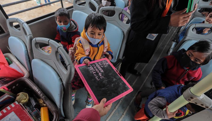 Con cientos de hijos de jornaleros sin teléfonos inteligentes ni ordenadores portátiles para asistir a las clases, la escuela volvió a abrir sus aulas bajo un puente, con el único mobiliario de una pizarra y un par de esterillas en el suelo.