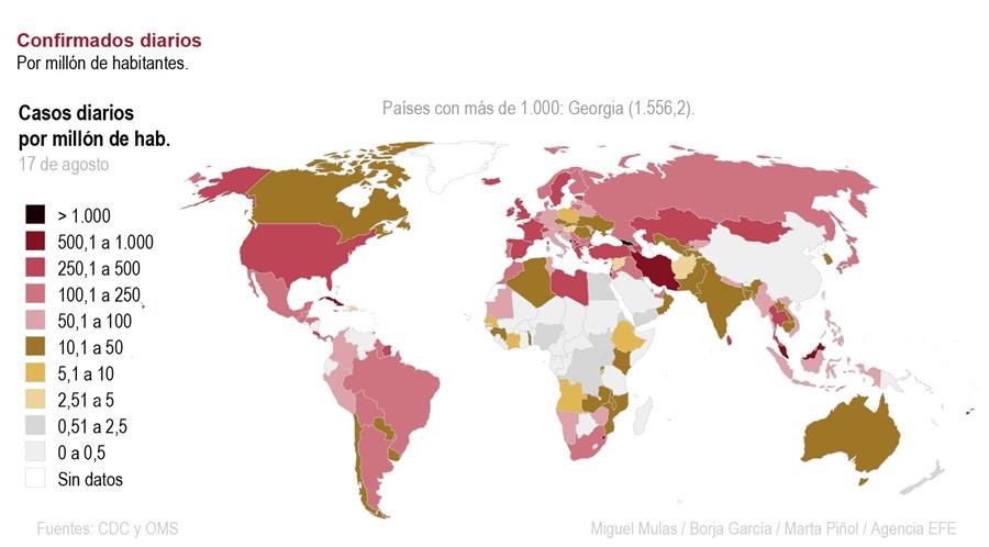 Las Américas y Europa fueron igualmente las dos regiones con la mayor tasa de mortalidad en la última semana, establecida en 2 y 1,1 decesos por 100.000 habitantes, respectivamente.