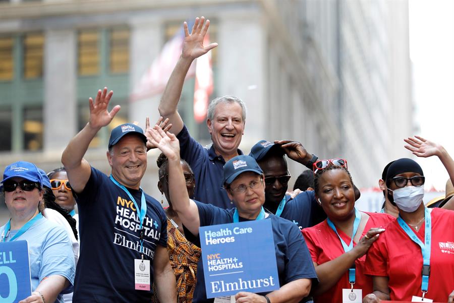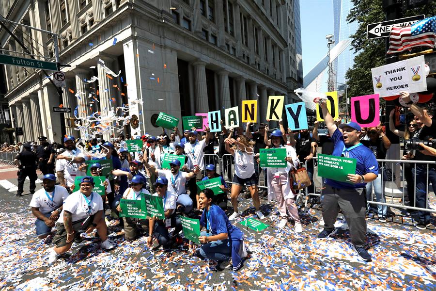 Nueva York, EE.UU.- Miles de enfermeros, médicos, bomberos, camareros, repartidores y demás trabajadores de primera línea desfilaron este miércoles sin mascarillas por las calles de Nueva York para celebrar el fin de las restricciones impuestas por la pandemia, en el mayor desfile que se celebra en la ciudad desde que prácticamente cerró a cal y canto en marzo de 2020.