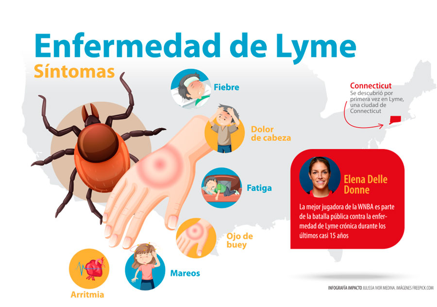 La enfermedad de Lyme es la enfermedad más conocida asociada a las garrapatas. Se descubrió por primera vez en Lyme, una ciudad de Connecticut, después de que un grupo de personas desarrollara la enfermedad. Los primeros síntomas generalmente ocurren después de que la garrapata ya no está adherida al cuerpo, por lo que es tan importante identificar las erupciones características asociadas con las enfermedades asociadas a las garrapatas. El eritema migratorio es la forma más fácil de diagnosticar la enfermedad de Lyme, con su característica apariencia de ojo de buey. Elena Delle Donne, una de las mejores jugadoras de la historia de la WNBA, es parte de la batalla pública contra la enfermedad de Lyme crónica durante los últimos casi 15 años.