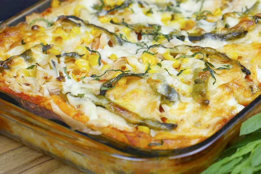 En un refractario cuadrado se colocan las tortillas cubriendo el fondo con la mitad del guisado de pollo, se pone otra cama de tortillas y el resto del pollo, se espolvorea con el queso y se mete al horno durante 25 min. A 180 C°