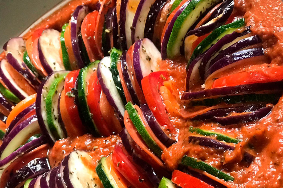 En un molde distribuye la salsa que preparaste y alternas rebanadas de calabaza, jitomate y berenjena colocando sobre la mezcla, tratando de crear un patrón decorativo. Barniza los vegetales con la mezcla de aceite y especias, cubre con papel aluminio, hornea por 40 minutos, retira el papel y deja hornear 20 minutos más hasta que los vegetales estén suaves y dorados ligeramente.