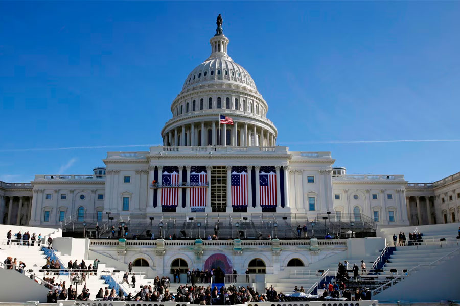 En esta fotografía del 15 de enero de 2016, el Capitolio de los Estados Unidos enmarca el escenario durante un ensayo de la ceremonia de juramentación del presidente electo Donald Trump en Washington. (Foto: VOA)
