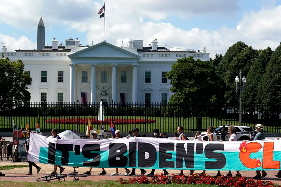 Activistas climáticos se concentran frente a la Casa Blanca en Lafayette Square, el 4 de julio de 2023, en Washington, para exigir al presidente Joe Biden que declare una emergencia climática y que aparte al país de los combustibles fósiles lo antes posible. Tras el bloqueo del Congreso, Biden hará uso de la autoridad ejecutiva para crear un Cuerpo Climático Estadounidense al estilo del New Deal que servirá como un importante programa de formación para empleos verdes. (Foto: AP/Yuri Gripas/Archivo)