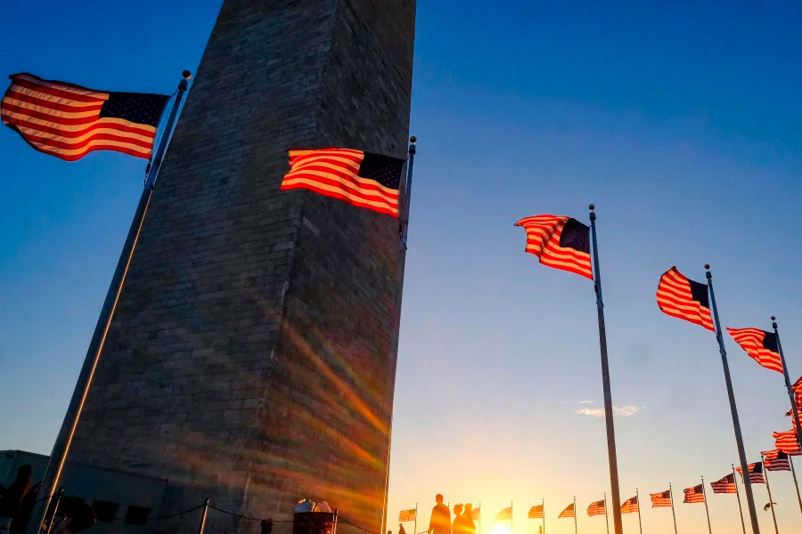 Tourists walk around the base of the Washington Monument on Presidents Day weekend as the sunsets, Feb. 19, 2017, in Washington. (AP Photo/J. David Ake, file)
