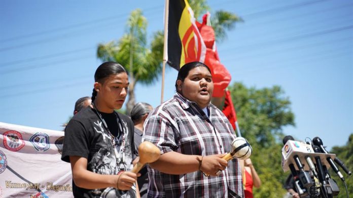 Con cantos en Kumeyaay, unos 70 asistentes celebraron que la efigie ya no esté en el parque en el este de la ciudad.