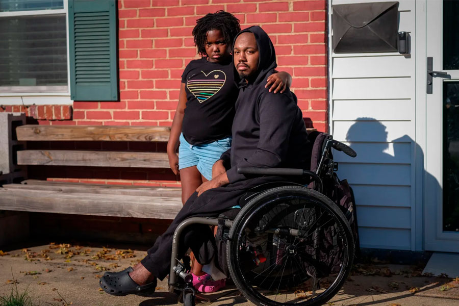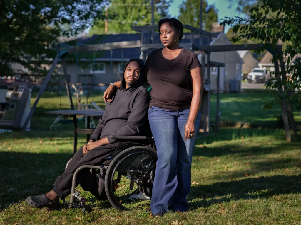 Leon Harris le atribuye a su esposa, Tierra, el mérito de haberle ayudado a encontrar la felicidad y a reconstruir su vida después de que las heridas de bala le quitaron la capacidad de caminar.(Meredith Rizzo for KFF Health News)