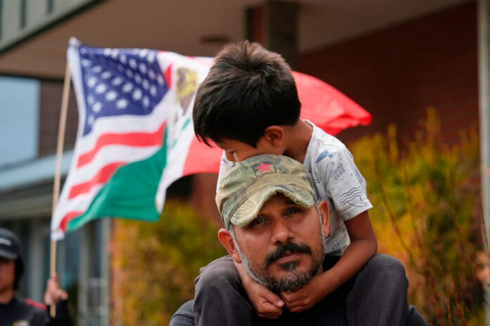 Gerardo Santos carga en sus hombros a su hijo de 5 años, Xavier, durante una protesta contra las redadas migratorias, el 11 de julio de 2025, en Oxnard, California. (Foto: AP/Jae C. Hong/Archivo)