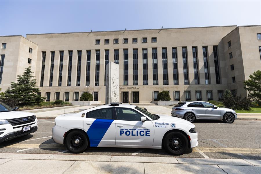 Desde la entrada principal al juzgado, en la avenida de Pensilvania, en Washington DC, se ve la cúpula del Capitolio, sede del Congreso del país y escenario hace poco más de dos años de un asalto por parte de cientos de seguidores de Trump.