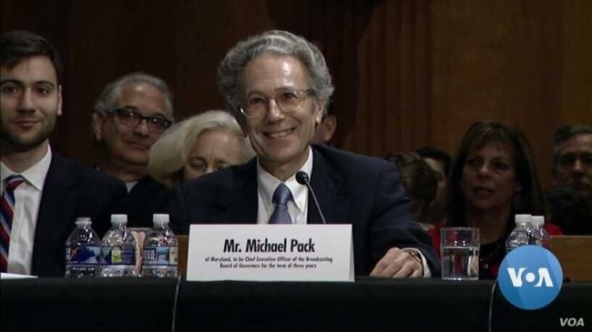 Trump nominó a Pack para dirigir USAGM, pero el Senado retrasó la confirmación durante dos años, hasta junio de 2020. Finalmente actuó después de que Trump comenzó a atacar la cobertura de la VOA y exigió que los republicanos del Senado impulsaran la nominación. Los senadores demócratas habían expresado su preocupación sobre la idoneidad del documentalista para el papel y sobre una investigación sobre el presunto mala gestión en una organización sin fines de lucro que fundó.