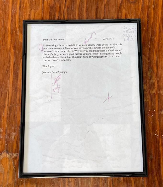 El senador no estaba pero entregaron en la oficina una carta abierta que «Guac» escribió hace nueve años a los poseedores de armas para instarles a que «por su propio bien» aceptasen la comprobación del historial del interesado en comprar armamento.