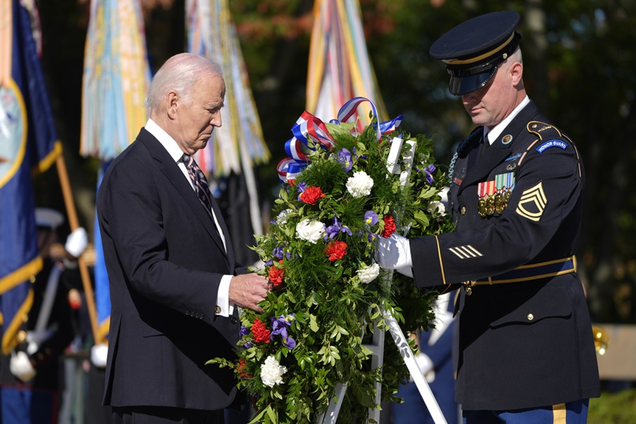 El presidente Joe Biden colocó una corona en el Cementerio Nacional de Arlington el lunes por el Día de los Veteranos mientras miles de personas marchaban por las calles de Nueva York. Se realizaron desfiles más pequeños en todo el país para honrar a los estadounidenses que han servido en las fuerzas armadas.