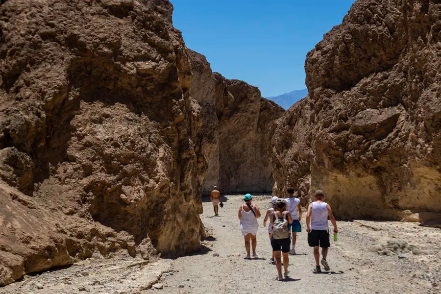 Varios excursionistas regresan a sus vehículos luego de recorrer parte del cañón Golden en el Parque Nacional Valle de la Muerte, California, el martes 11 de julio de 2023. Julio es el mes más caluroso en el parque, con una temperatura máxima promedio de 46,5 grados Celsius (116 grados Fahrenheit). (Foto: AP/Ty ONeil)
