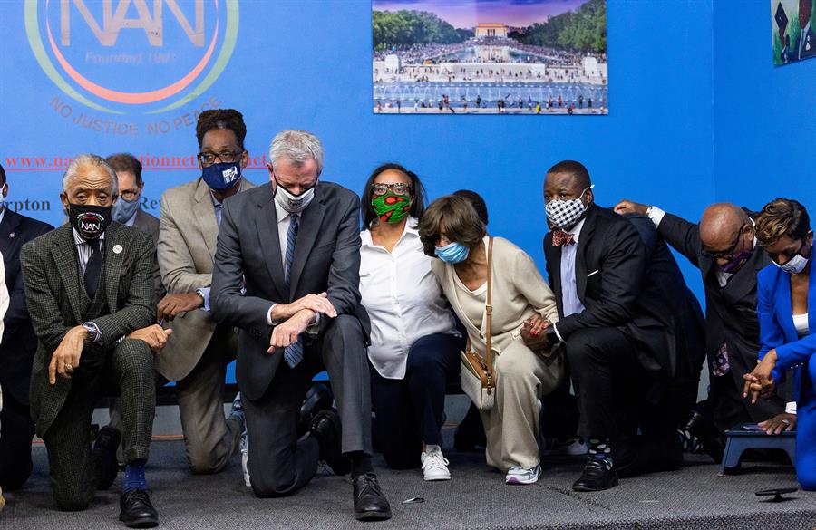 Nueva York, EE.UU.- Autoridades y líderes comunitarios de Nueva York se arrodillaron este martes durante 9 minutos y 29 segundos en memoria de George Floyd, el hombre negro asesinado hace un año por asfixia cuando un policía blanco le hincó la rodilla en el cuello durante ese lapso de tiempo.