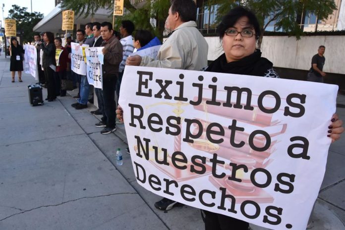 Fotografía de archivo de Esmeralda Ibarra (dcha.), activista de la organización Hermandad Mexicana Transnacional, sostiene un cartel que exige respeto a los derechos de los inmigrantes durante una protesta realizada frente al edificio del Servicio de Ciudadanía e Inmigración (USCIS) en Los Ángeles, California. (Foto: EFE/Iván Mejía)