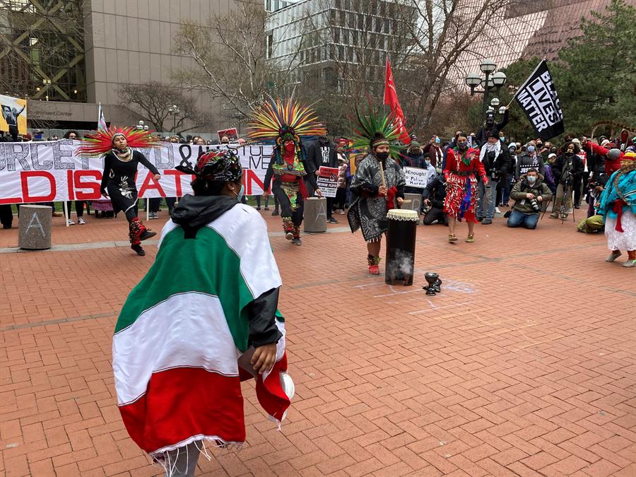 Mineápolis, EE.UU.– Vestidos con plumas, cintas y atuendos de colores, los Kalpulli Yaocenoxtli se conjuraron este lunes delante de la sede del juicio contra Derek Chauvin, el expolicía acusado de matar al afroamericano George Floyd, para pedir el fin de la brutalidad contra las minorías en EE.UU.