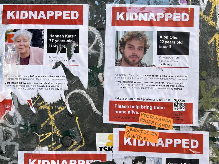 Los carteles proisraelíes llevan por título SECUESTRADO, y exponen casos individuales de alguno de los más de 200 israelíes raptados por Hamás; los propalestinos, mucho menos abundantes, se titulan ASESINADO, y del mismo modo presentan con nombre y apellido a las víctimas de los bombardeos sobre Gaza.