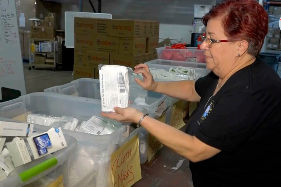 La voluntaria guatemalteca Marta Contreras ayuda en la recolección de insumos para los afectados por la guerra de Ucrania en el centro GEM de Miami, Florida. (Foto: Antoni Belchi/VOA)