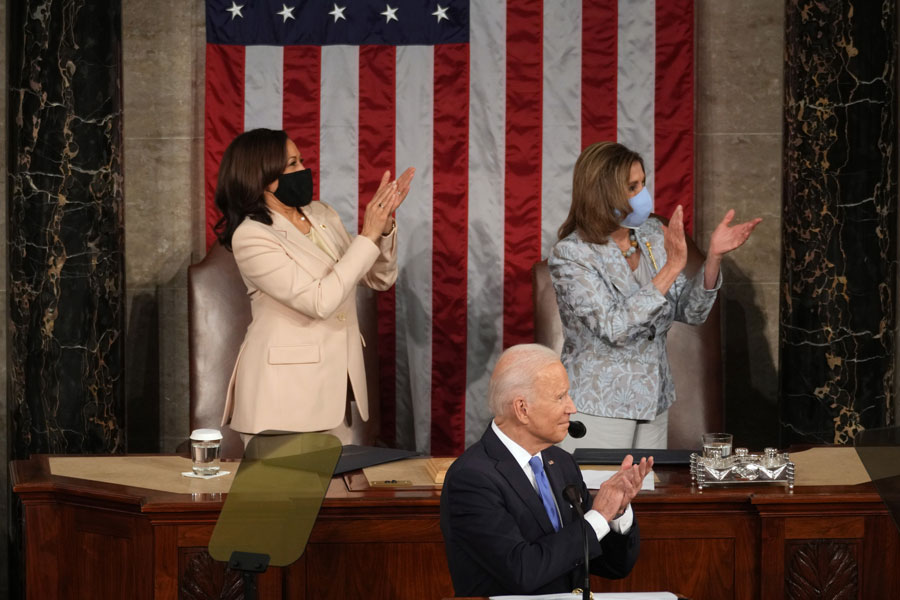 Biden empezó su alocución rindiendo homenaje a las dos mujeres que le siguen en la línea de sucesión: la vicepresidenta del país, Kamala Harris, y la presidenta de la Cámara de Representantes, Nancy Pelosi.