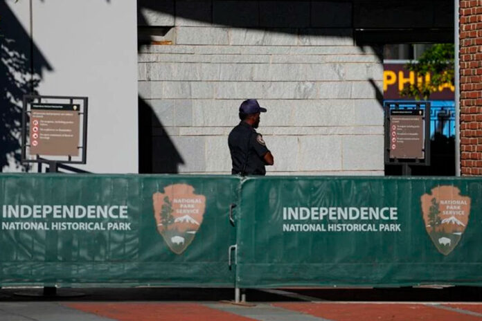 A guard stands at the entrance to The Liberty Bell center that is closed due to a government shutdown in Philadelphia, Wednesday,Oct. 1, 2025. (Photo: AP/Matt Rourke)