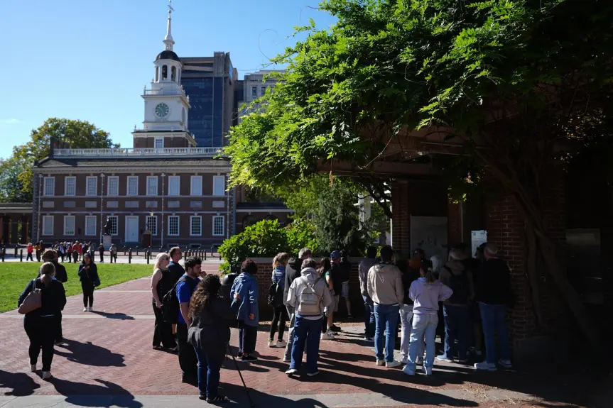 Tourist crowd around a window to view the Liberty Bell with Independence Hall in the background in Philadelphia, Wednesday, Oct. 1, 2025. (Photo: AP/Matt Rourke)