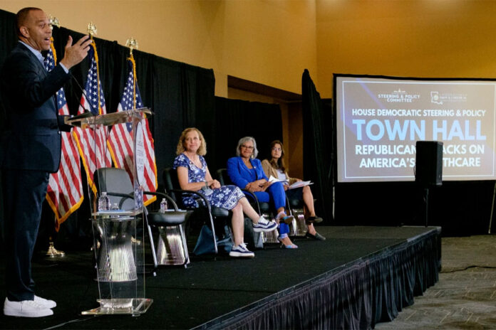 House Minority Leader Hakeem Jeffries leads a health care town hall with U.S. Rep Troy Carter, D-La., at Xavier University in New Orleans, Thursday, July 10, 2025. (Photo: AP/John McCusker/The Times-Picayune/The New Orleans Advocate)