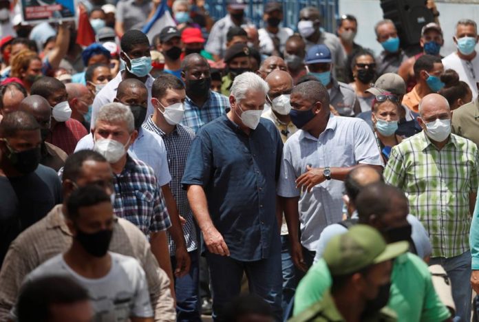 El presidente de Cuba, Miguel Díaz-Canel, ha comparecido hoy en dos ocasiones. Primero acudió a San Antonio de los Baños donde, acompañado de un grupo de partidarios y fuerzas de seguridad, acusó a «gente mercenaria pagada por el gobierno de Estados Unidos» de organizar las protestas.