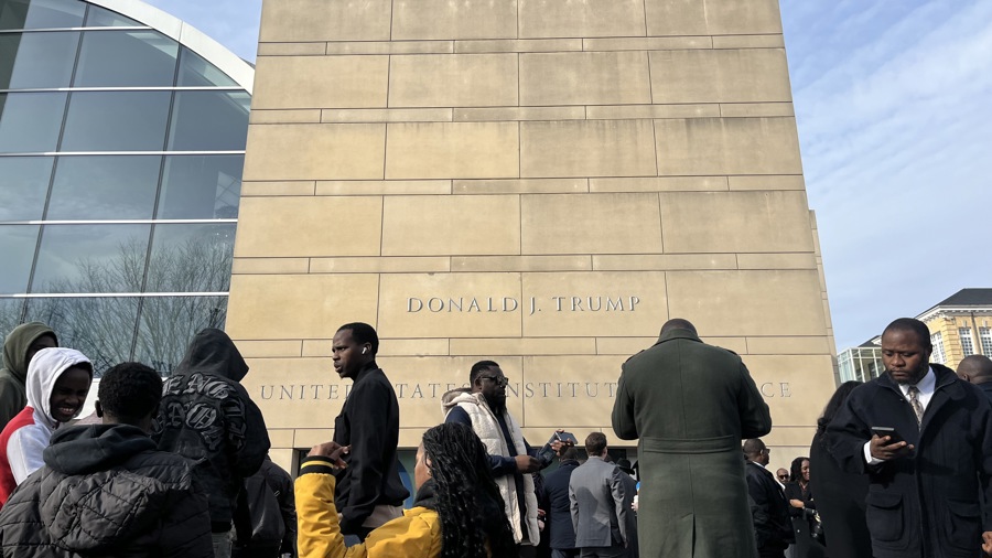 Personas se reúnen en la puerta del Instituto de Paz de Estados Unidos (USIP) rebautizado con el nombre Donald J. Trump, este jueves en Washington (EE.UU.). El Departamento de Estado rebautizó el USIP con el nombre del presidente, Donald Trump, para reivindicar la política exterior del mandatario, en medio de una disputa legal por el control de la institución. (Foto: EFE/Leonor Trinidad)