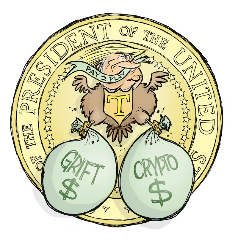 Por ejemplo, el acceso potencial a Trump en su club Mar-a-Lago ahora tiene una cuota de iniciación de 1 millón de dólares (frente a los 100,000 en 2016). En mayo, el presidente organizó una gala en un club de golf de Virginia para los mayores compradores de su meme coin, un token digital intrínsecamente sin valor por el cual los 220 asistentes al evento desembolsaron 148 millones de dólares. Se informa que la empresa, junto con una meme coin aparte de $MELANIA, generó a los Trump 385 millones de dólares netos.