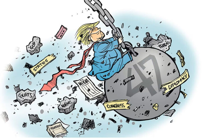 Para su segundo mandato, ya sin las limitaciones de las barreras que el «establishment» conservador colocó en su primera etapa presidencial, y rodeado de aduladores e incompetentes, Trump no ha perdido tiempo intentando vivir sus fantasías autoritarias mientras es incapaz de lograr que el sistema funcione con eficiencia.