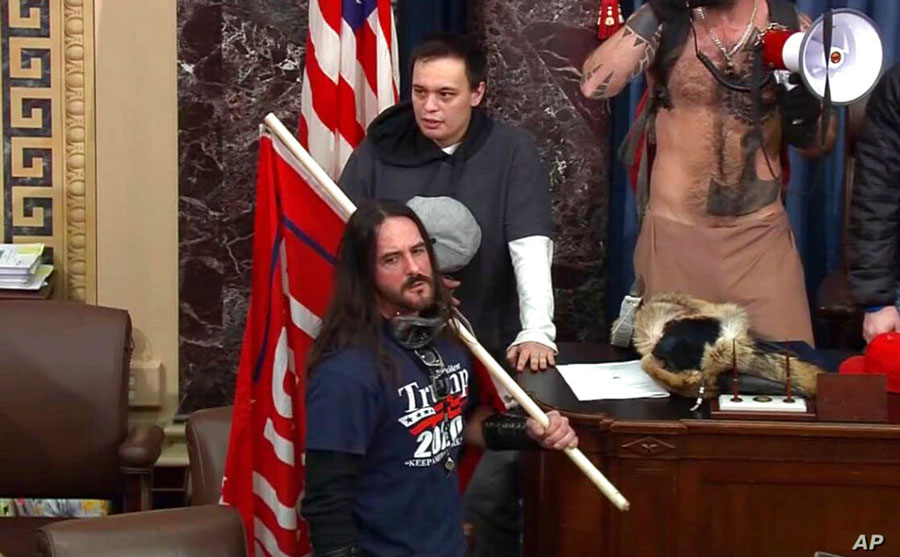 Tomas de video muestra a Hodkings, de 38 años, vestido con una camiseta de Trump 2020 y llevando bandera sobre su hombro dentro del Senado. También se tomó una selfi con el hombre con un casco con cuernos y otros que entraron a la cámara en el estrado a sus espaldas.