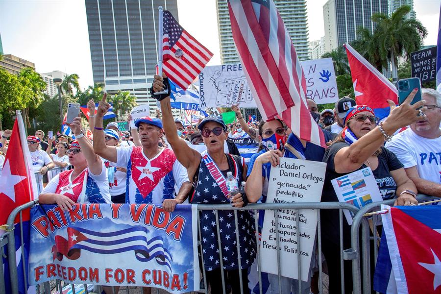 Organizado por la Alcaldía de Miami, el acto reunió en el parque Bayfront, en el centro de Miami, a cubanos, venezolanos, nicaragüenses y también a otros latinoamericanos, según se pudo ver por las banderas que enarbolaban junto a carteles con eslóganes como «SOS Cuba», «Patria y vida» y «Díaz Canel, rindete».