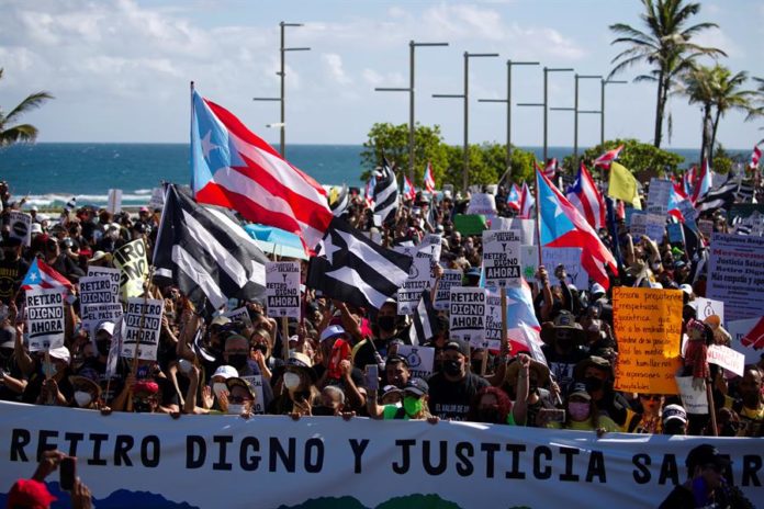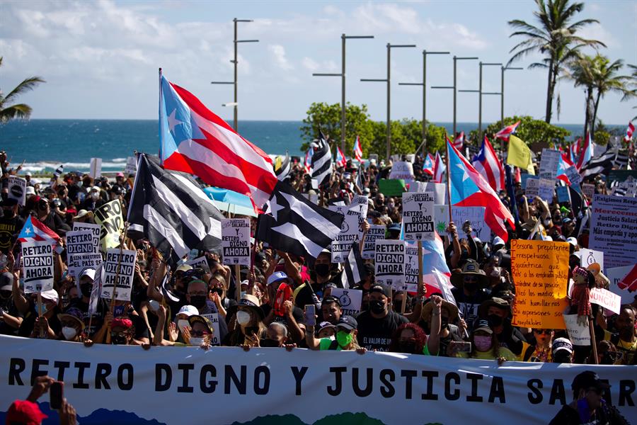 Acompañados de música y portando banderas de Puerto Rico, los manifestantes aludieron continuamente en sus consignas y en los lemas de sus pancartas a los reclamos de mejoras salariales y de un retiro digno.