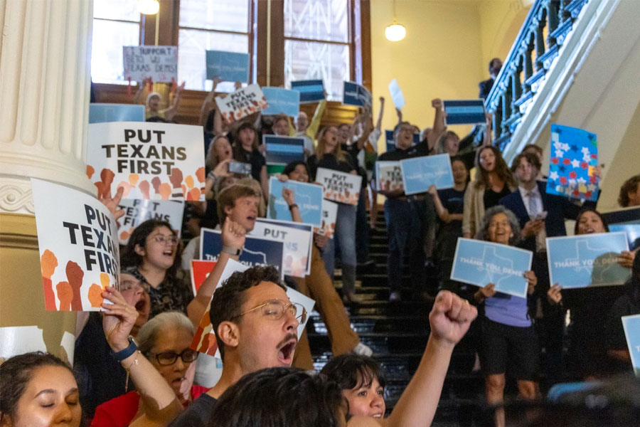 Supporters for the returning Texas democrats chant as members enter the house at the Texas Capitol in Austin, Texas, Monday, Aug. 18, 2025. (Photo: AP/Stephen Spillman)