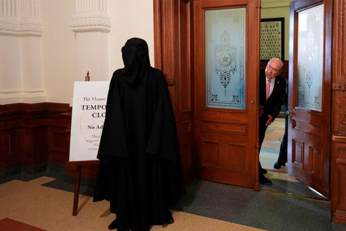 Texas state Sen. Juan "Chuy" Hinojosa, right, looks at a protester dressed as death standing outside of the House Chamber where Democratic Texas state Rep. Nicole Collier refuses to leave due to a required law enforcement escort, Tuesday, Aug. 19, 2025, in Austin, Texas. (Photo: AP/Eric Gay)