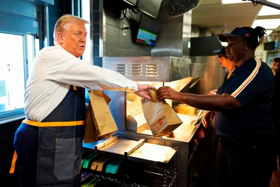 Después de entregar varios pedidos a través de la ventanilla de servicio directo al auto, Trump —aún con delantal— se asomó para recibir preguntas de la prensa reunida en el exterior. El republicano, quien ha promovido constantemente falsedades sobre su derrota electoral de 2020, dijo que respetaría los resultados de los comicios del próximo mes “si es una elección justa”.
