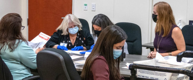 Personal del Departamento de Elecciones del Condado de Miami-Dade organiza votos, en la sede del departamento en El Doral, ciudad aledaña a Miami, Florida (EEUU). EFE/Giorgio Viera