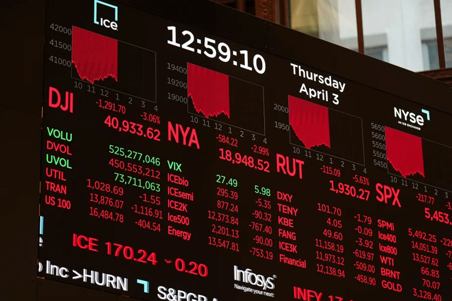 Una pantalla muestra los índices bursátiles mientras los corredores trabajan en la Bolsa de Valores de Nueva York, el jueves 3 de abril de 2025. (Foto: AP/Seth Wenig)