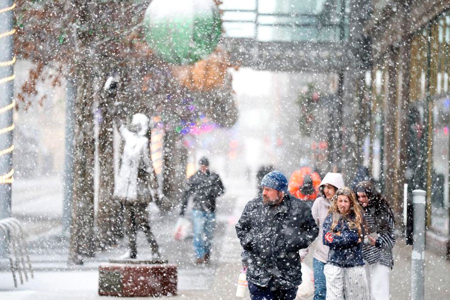 Una intensa nevada cae en el centro comercial Nicollet el domingo 28 de diciembre de 2025, en Minneapolis. (Foto: AP/Jerry Holt/Star Tribune)