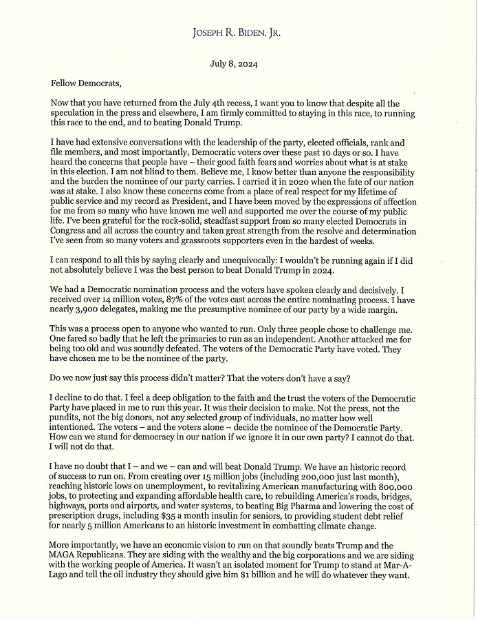 Ahora que han regresado del receso del 4 de julio, quiero que sepan que a pesar de todas las especulaciones en la prensa y en otros espacios, estoy firmemente comprometido a permanecer en esta contienda, a llegar hasta el final y a vencer a Donald Trump.