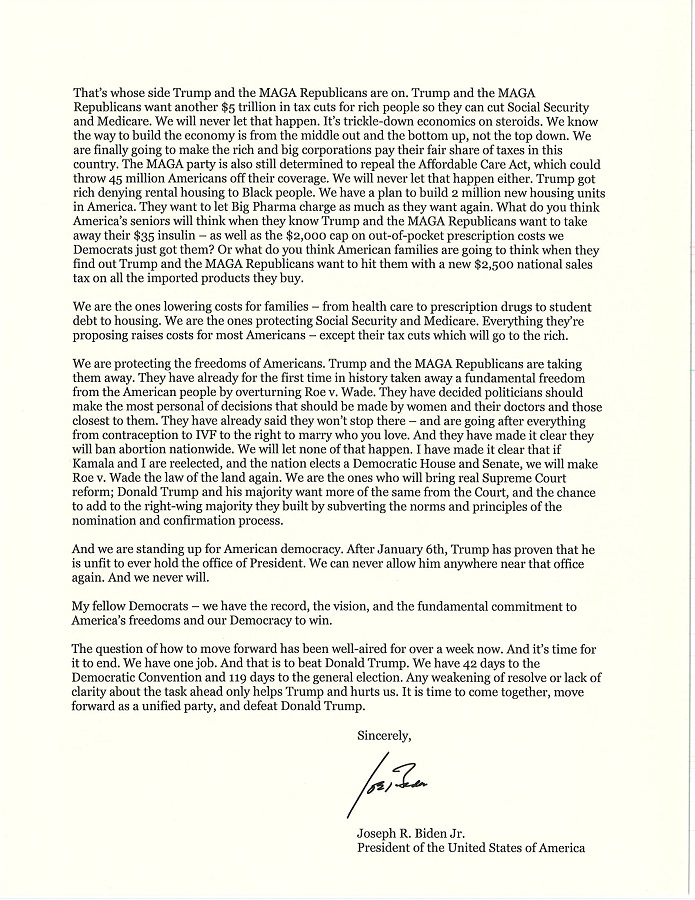 No tengo ninguna duda de que yo, y nosotros, podemos y venceremos a Donald Trump. Podemos basarnos en nuestro récord histórico de éxitos para competir. Desde la creación de más de 15 millones de puestos de trabajo (incluidos 200.000 tan solo el mes pasado), el logro de mínimos históricos en materia de desempleo, la revitalización de la industria manufacturera estadounidense con 800 mil puestos de trabajo, la protección y ampliación de la atención médica asequible, la reconstrucción de carreteras, puentes, autopistas, sistemas de agua, puertos y aeropuertos de Estados Unidos; hasta vencer a las grandes farmacéuticas y reducir el costo de los medicamentos recetados, incluida la insulina de 35 dólares al mes para las personas mayores, brindar alivio de la deuda estudiantil a casi 5 millones de estadounidenses e impulsar una inversión histórica en la lucha contra el cambio climático.