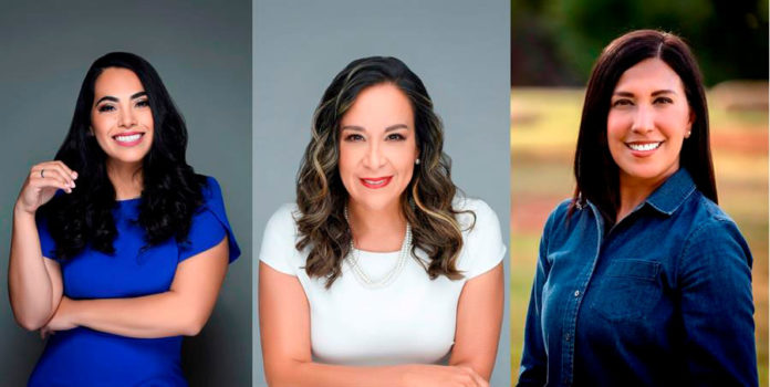 Fotografías de campaña donde aparecen las latinas republicanas (de izq. a dcha.) Mayra Flores, Mónica de La Cruz y Cassy García, conocidas como "La triple amenaza", que buscan conquistar con la ayuda del voto latino los distritos 34, 15 y 28, todos fronterizos con México. (Foto: EFE/Fotos de campaña)