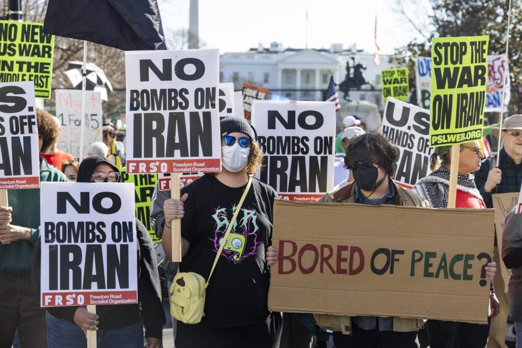 Manifestantes se concentraron frente a la Casa Blanca en Washington D. C., Estados Unidos, el 28 de febrero de 2026 para protestar contra los ataques militares lanzados por Estados Unidos e Israel contra Irán. EFE/EPA/JIM LO SCALZO