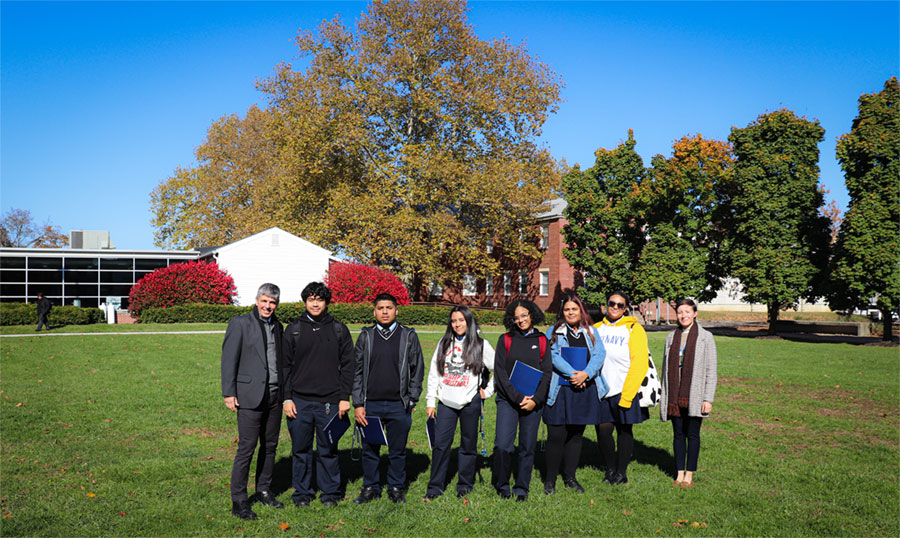 Dr. Christopher Palladino and Allyssa Hampson pose with Esperanza Academy high school students during their visit to the University of Valley Forge. (Photo: Credit/Sierra Guenst)