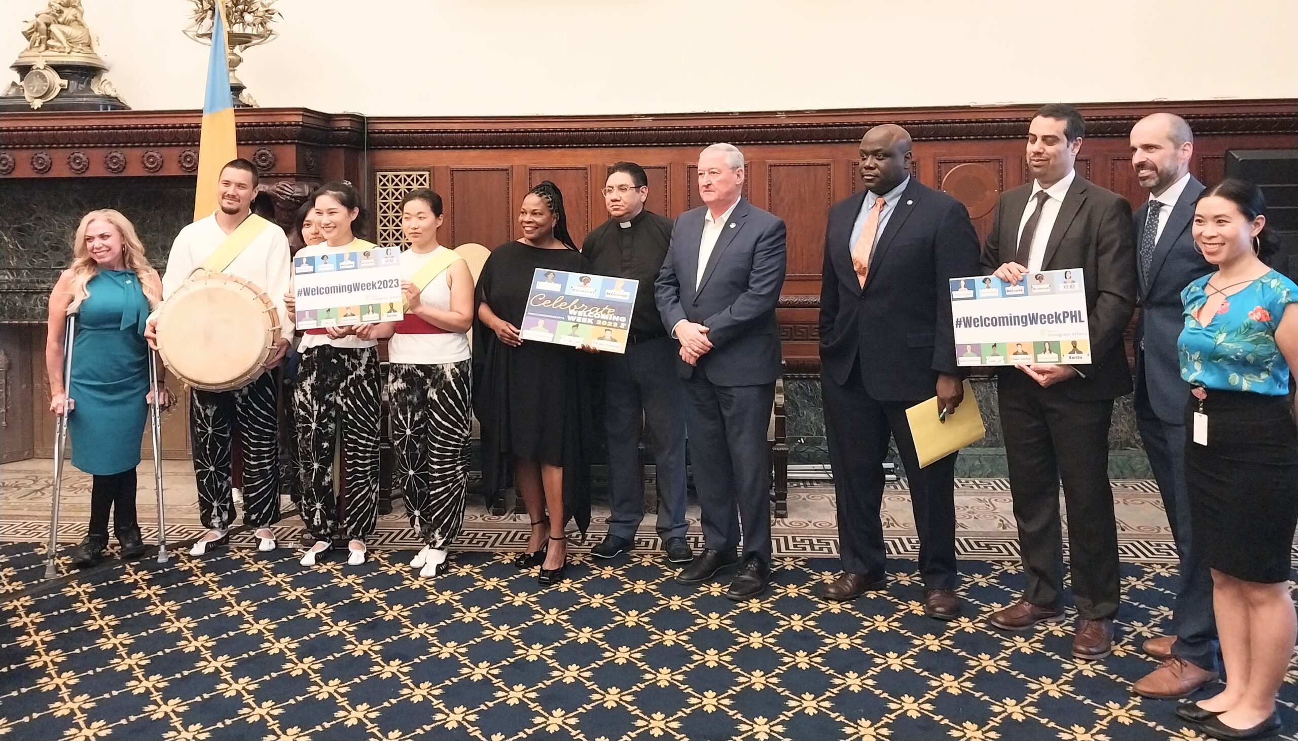 El alcalde James Kenney anunció en conferencia de prensa la Semana de Bienvenida el 5 de septiembre en el salón de recepciones del ayuntamiento. Le acompañaron Alain Joinville, director de comunicaciones estratégicas y programas de la OIA; Kelly Lee, jefe de la cultura de la oficina de artes, cultura y economía creativa del gobierno municipal; Rezwan Natiq, coordinador de acceso a la salud del centro de servicios a personas de diversas nacionalidades; el Rev. Adán Mairena, pastor del Ministerio de West Kensington y el grupo URIOL, un conjunto de percusión tradicional coreano con base en Filadelfia.