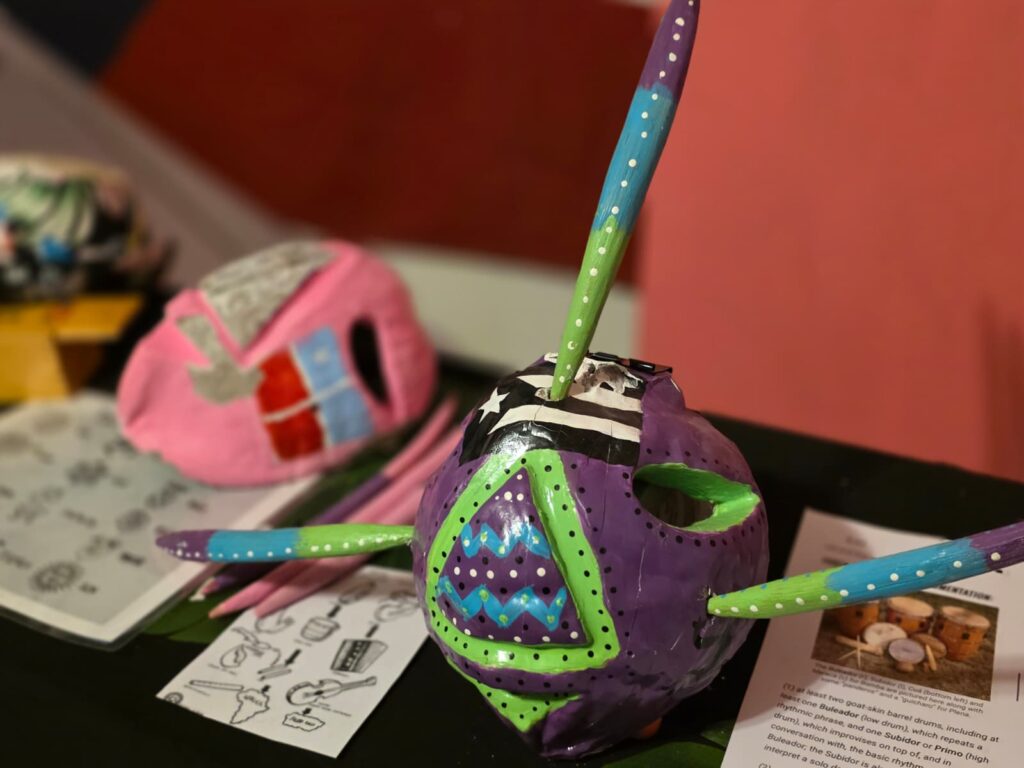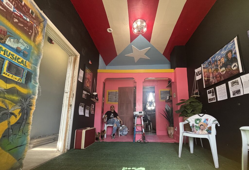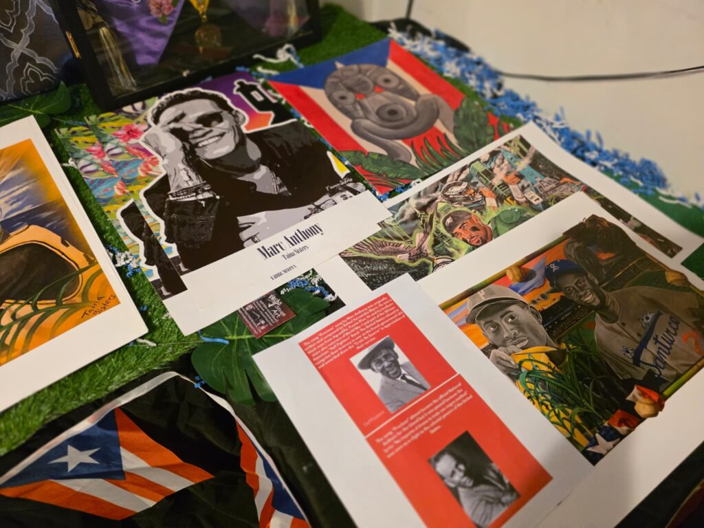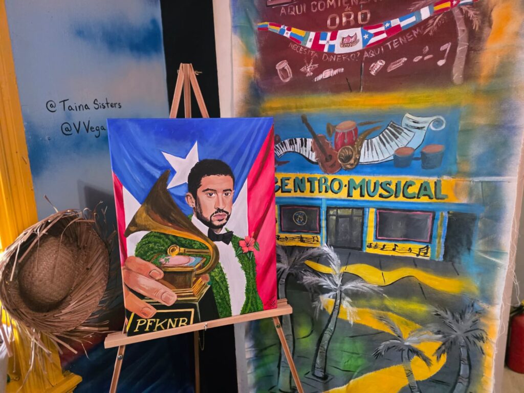 El espacio ofrece una experiencia cultural completa. Además de la instalación, los visitantes pueden adquirir impresiones de las obras, pines, stickers y otros artículos como recuerdo. También cuentan con una tienda virtual donde venden prints, pines y próximamente máscaras y casitas en 3D creadas por su hermana desde Carolina del Norte. “Siempre estamos bregando en algo. Hay que estar en movimiento”, afirma.