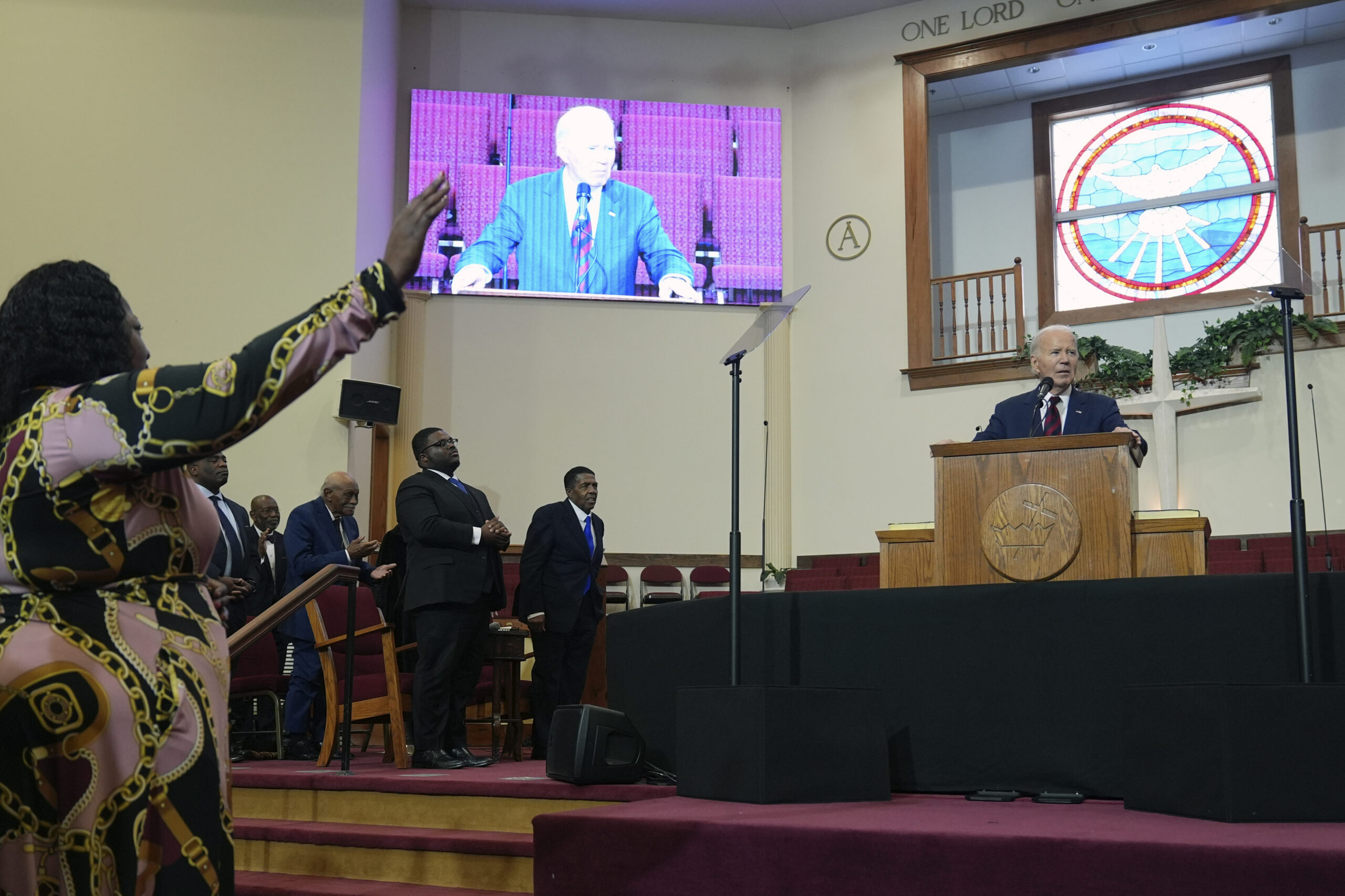 Biden habló a la congregación de la iglesia en la Royal Missionary Baptist Church sobre por qué entró en el servicio público — Martin Luther King Jr. y Robert F. Kennedy Jr. eran sus héroes políticos, dijo — y agradeció a Carolina del Sur por su apoyo