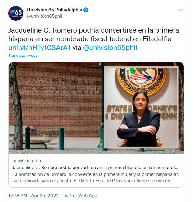la Asociación de Abogados Hispanos de Pensilvania, HBAPA, por medio de un comunicado dijo, “Estamos extremadamente orgullosos de que se haya confiado a un ex presidente de HBAPA (2018) y uno de nuestros miembros más activos para dirigir una institución legal tan importante en nuestra Commonwealth. Estamos seguros de que su perspicacia legal, integridad y pasión por la justicia serán un mérito para ella en este nuevo cargo… La Sra. Romero es una pionera por derecho propio, como lo demuestra aún más su nominación. Es la primera mujer en ser nominada por la Casa Blanca para el cargo de Fiscal Federal para el Distrito Este de Pensilvania y su confirmación también la convertiría en la primera mujer de color en ocupar ese cargo. Agradecemos a los senadores Bob Casey y Pat Toomey por trabajar juntos para recomendar a la Sra. Romero a la Casa Blanca y por resaltar, en su anuncio bipartidista de su nominación, que posee la inteligencia, la experiencia legal, la independencia y la honestidad e integridad incuestionables necesarias para dirigir el Departamento de Justicia de los Estados Unidos en el Distrito Este de Pensilvania”. Esperan la pronta confirmación del Senado de los EE. UU.